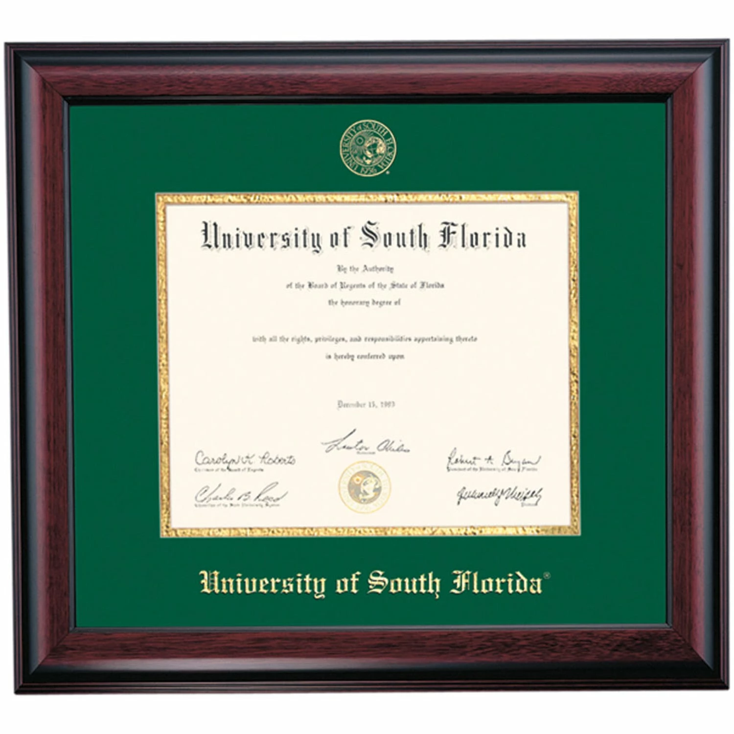 Celebrate your graduation in style with this handcrafted diploma frame. Custom crafted to fit your University of South Florida diploma, this frame is embossed with your school name and seal and features Hunter/Gold accent matting and high quality hardwood moulding.