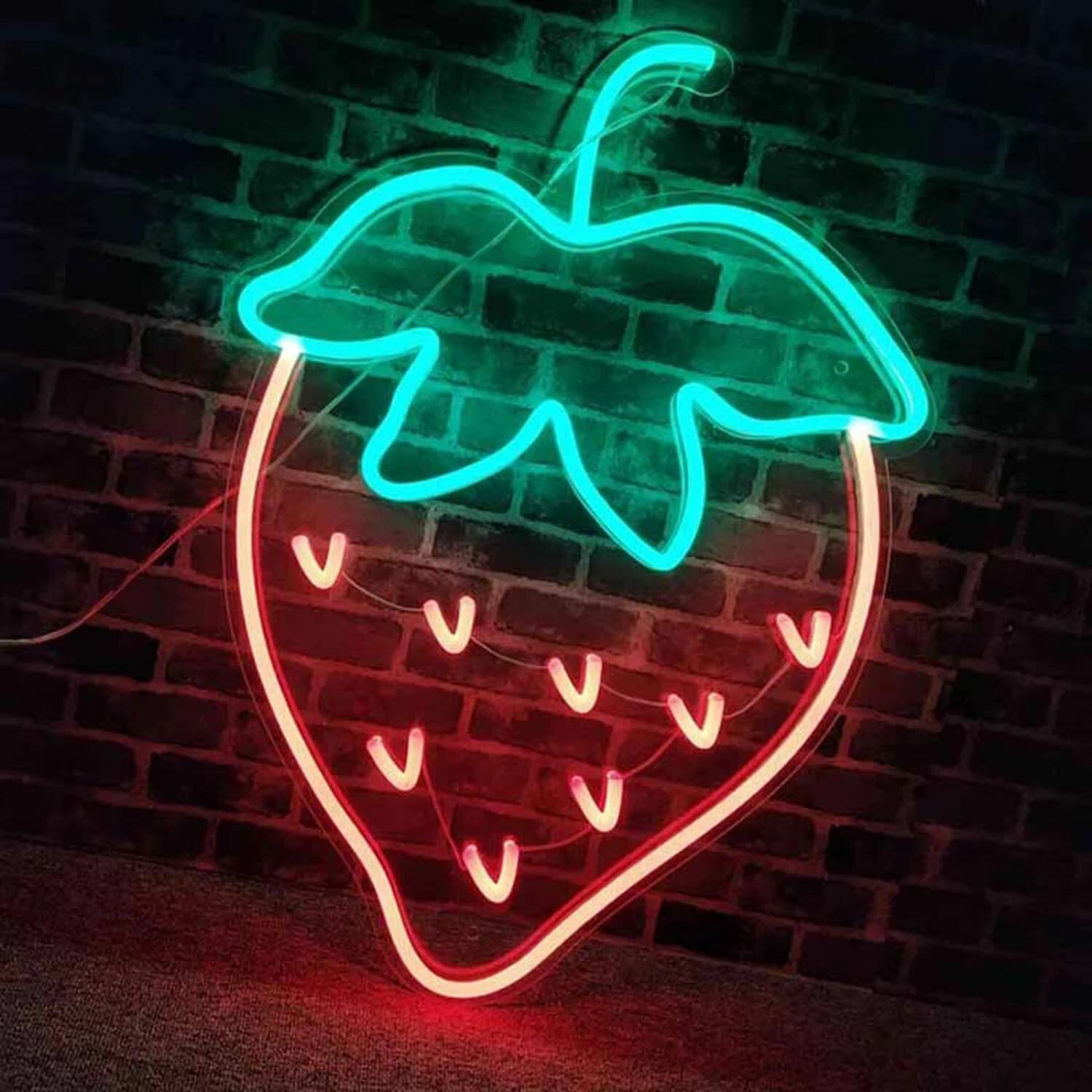 Strawberry… neon?…. Forever. This sweet neon sign will brighten your space with its colored light and playful design.