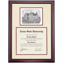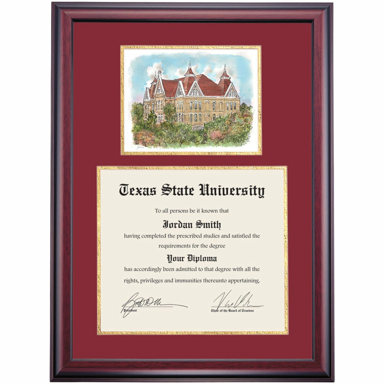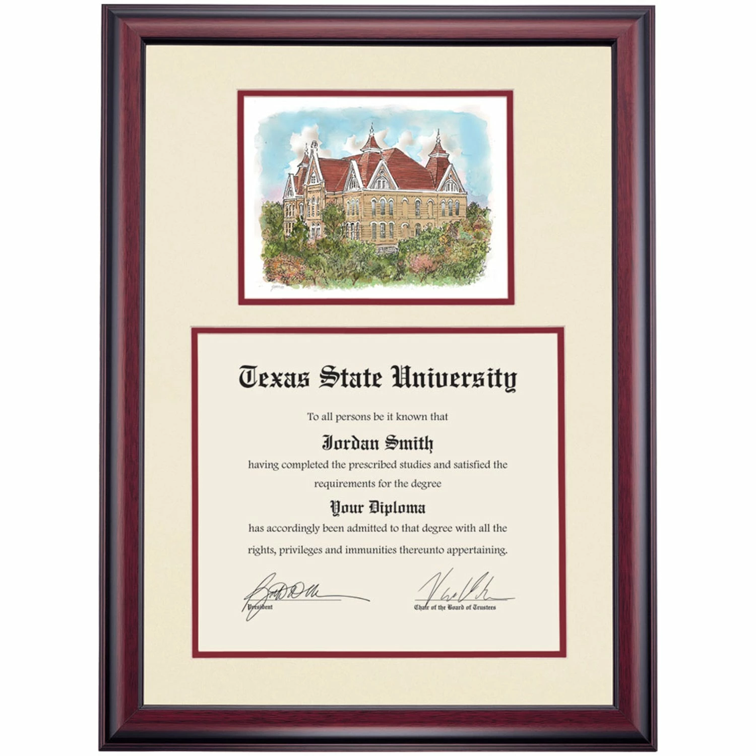 Celebrate your graduation in style with this handcrafted premier diploma frame which includes a Professional Print of Old Main. Custom crafted to fit your Texas State University diploma, this frame features accent matting and high quality hardwood moulding.