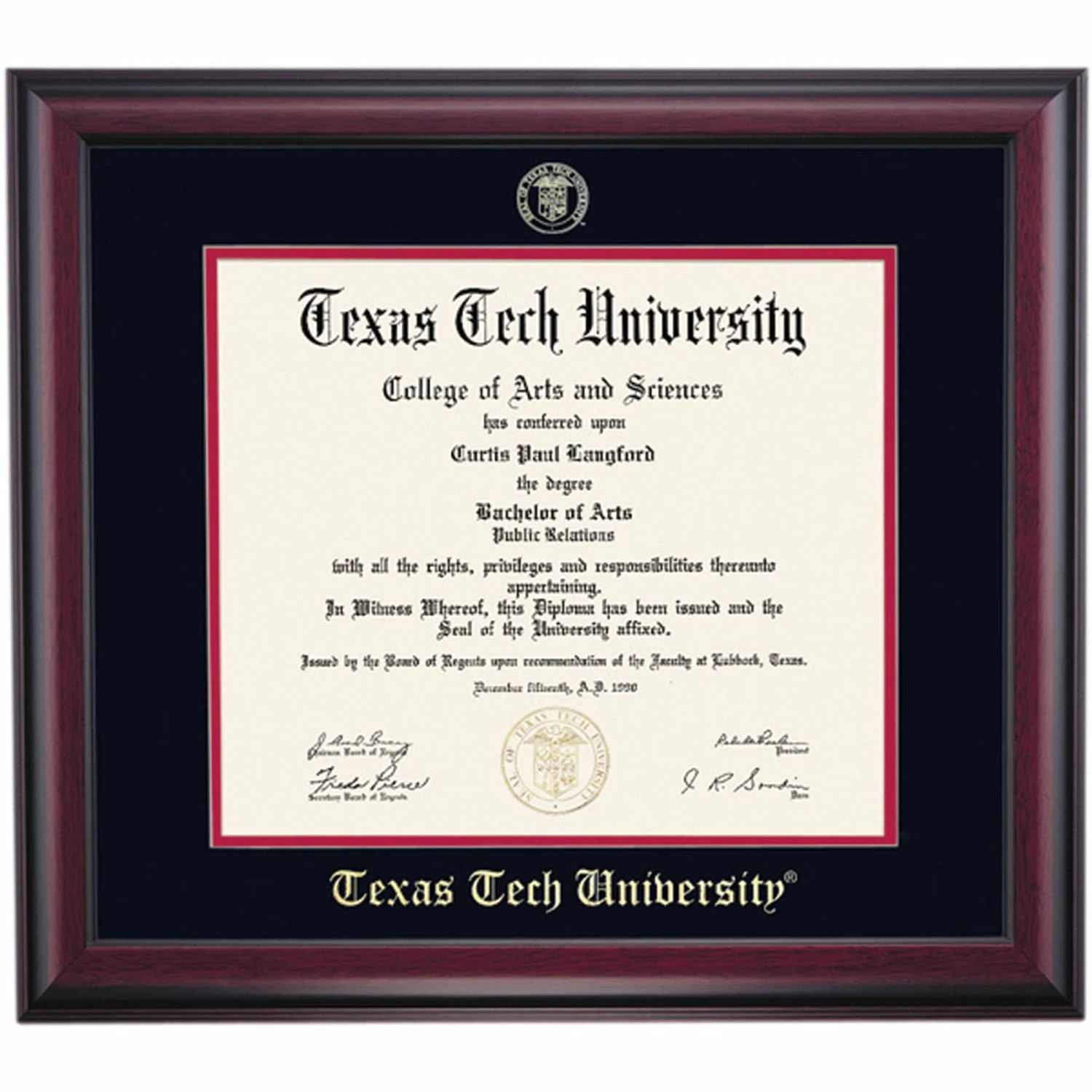 Celebrate your graduation in style with this handcrafted diploma frame. Custom crafted to fit your Texas Tech University diploma, this frame is embossed with your school name and seal and features Black/Cherry accent matting and high quality hardwood moulding.