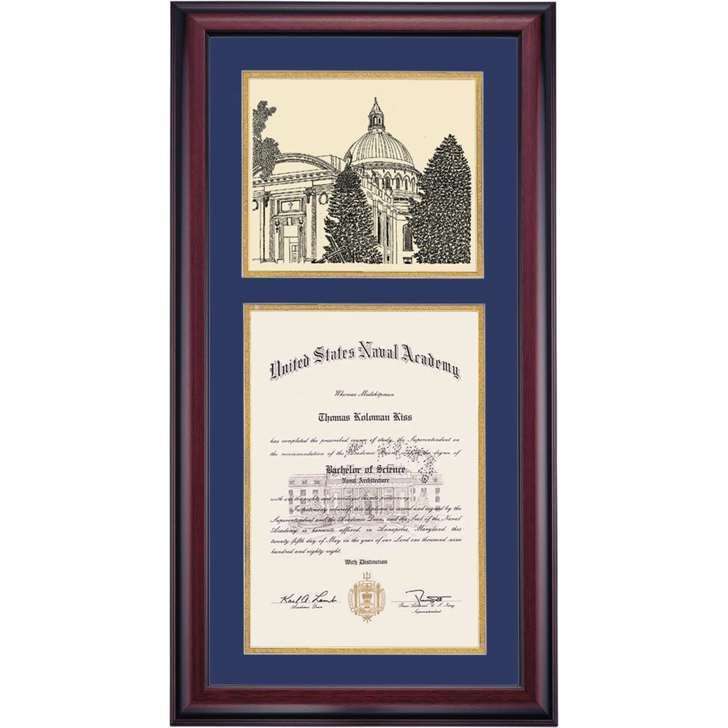 Celebrate your graduation in style with this handcrafted premier diploma frame which includes a Professional Pen & Ink Print of The Chapel. Custom crafted to fit your United States Naval Academy diploma or Commissioning Warrant, this frame features Navy/Gold accent matting and high quality hardwood moulding.