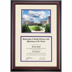 Celebrate your graduation in style with this handcrafted premier diploma frame which includes a Professional Photograph of the College Quad. Custom crafted to fit your University of Health Sciences and Pharmacy in St. Louis diploma, this frame features accent matting and high quality hardwood moulding.