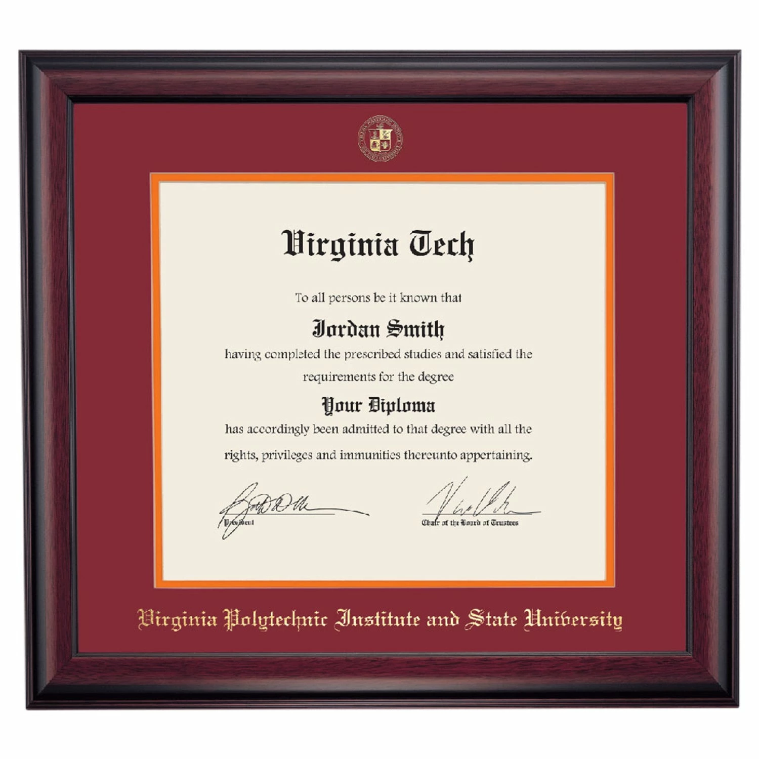 Celebrate your graduation in style with this handcrafted diploma frame. Custom crafted to fit your Virginia Tech diploma, this frame is embossed with your school name and seal and features Maroon/Orange accent matting and high quality hardwood moulding.