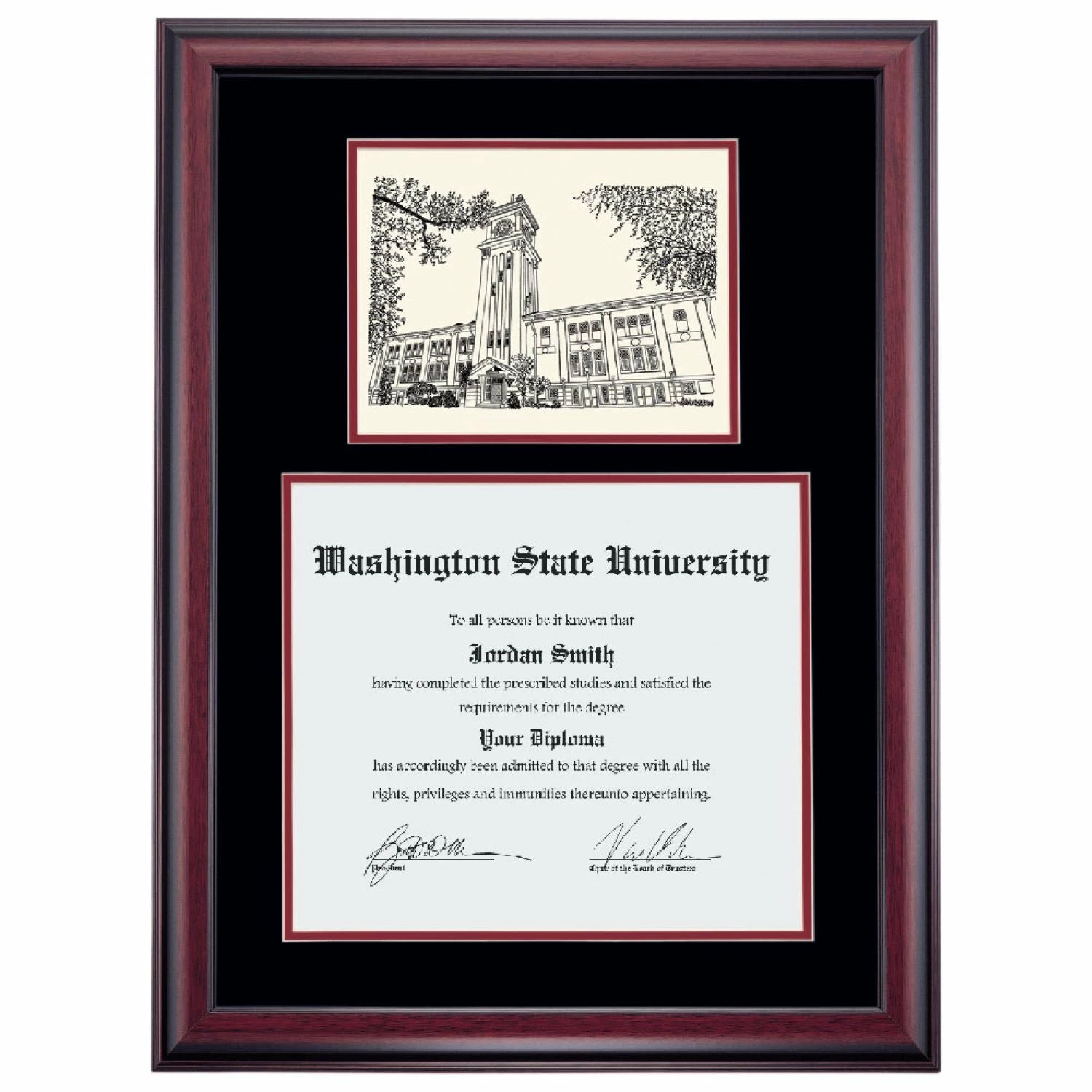 Celebrate your graduation in style with this handcrafted premier diploma frame which includes a Professional Pen & Ink Print of Bryan Hall. Custom crafted to fit your Washington State University diploma, this frame features accent matting and high quality hardwood moulding.