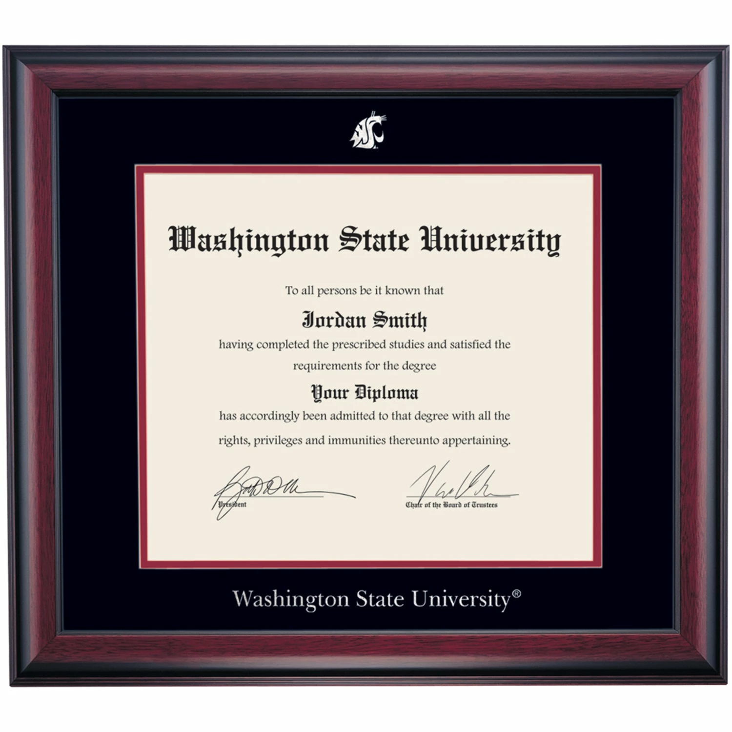 Celebrate your graduation in style with this handcrafted diploma frame. Custom crafted to fit your Washington State University diploma, this frame is embossed with your school name and seal and features Black/Maroon accent matting and high quality hardwood moulding.