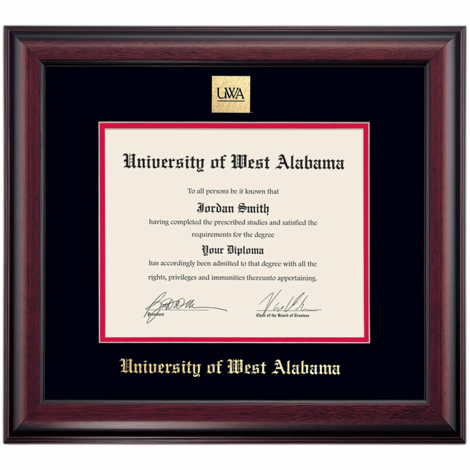 Celebrate your graduation in style with this handcrafted diploma frame. Custom crafted to fit your University of West Alabama diploma, this frame is embossed with your school name and seal and features Black/Cherry accent matting and high quality hardwood moulding.
