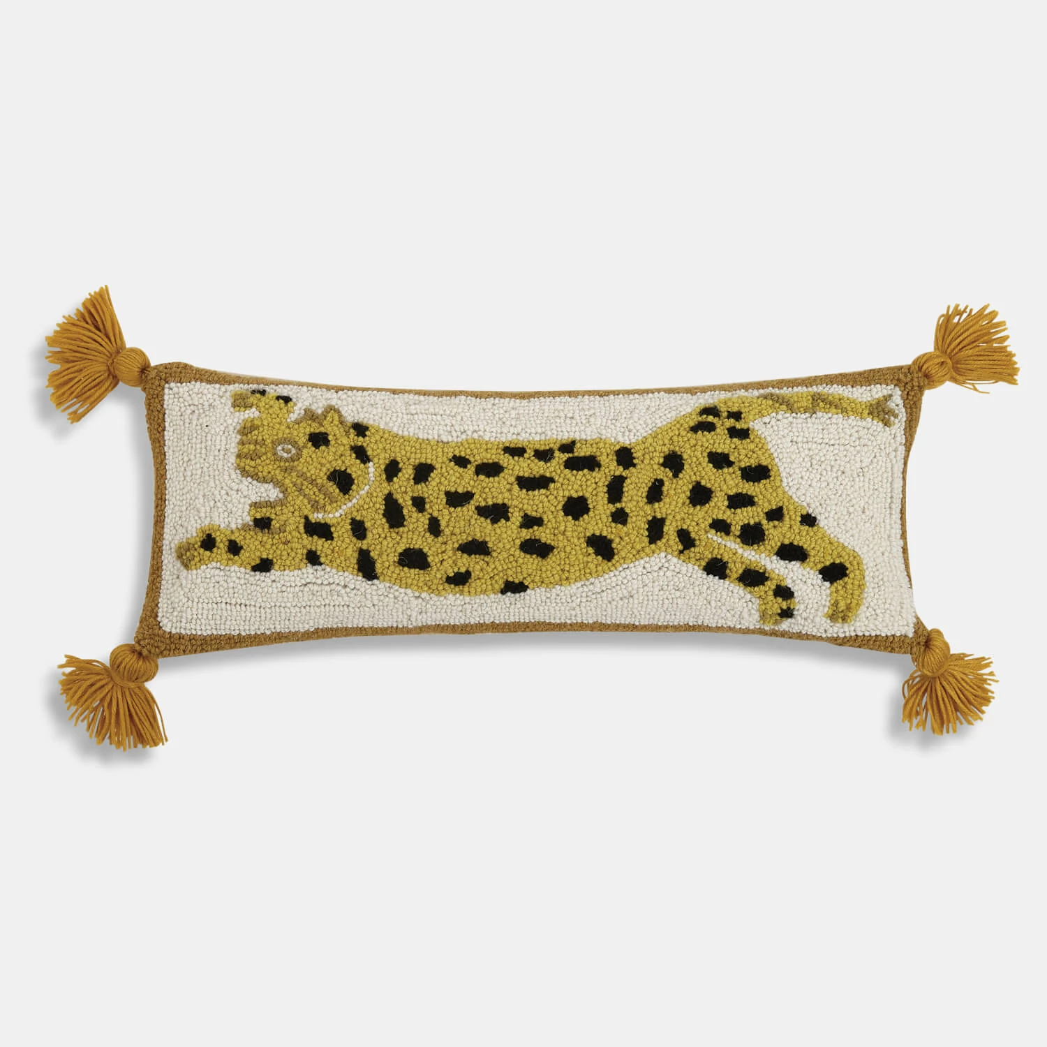 This hooked wool lumbar pillow gives tropical safari vibes with its leopard design. It features a velvet backing and offers great support.