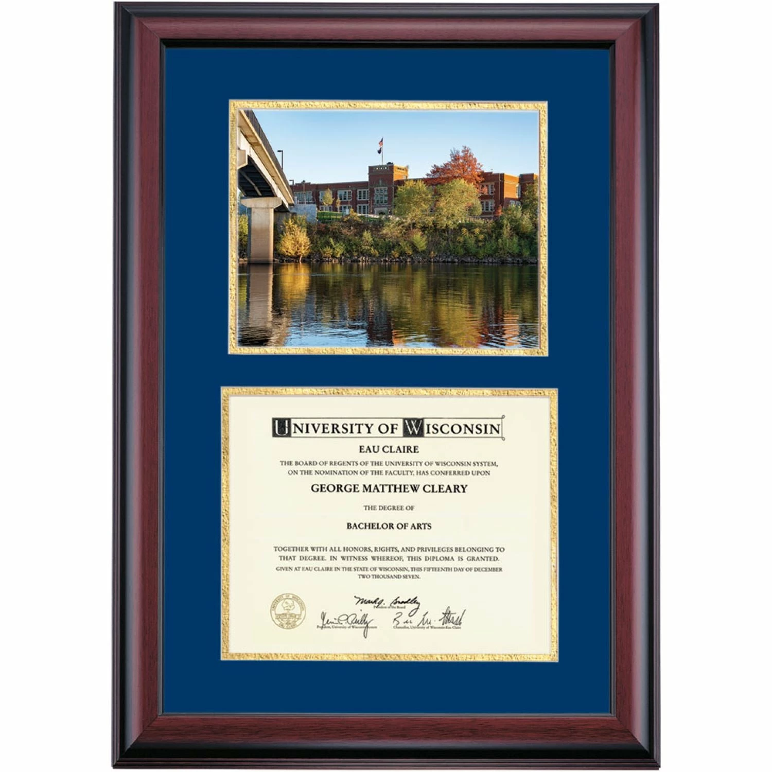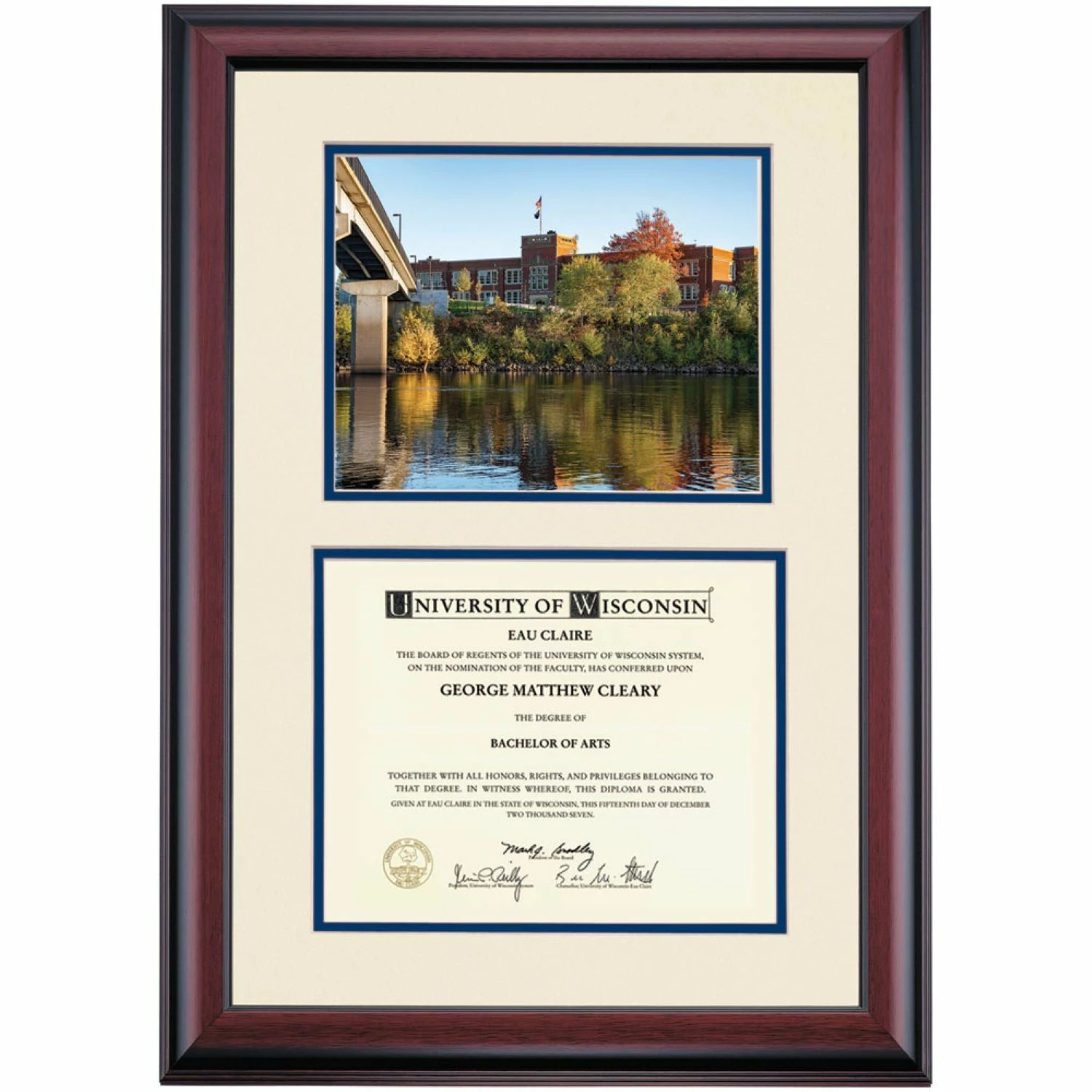 Celebrate your graduation in style with this handcrafted premier diploma frame which includes a Professional Photograph of Walk Bridge and Schofield Hall. Custom crafted to fit your University of Wisconsin-Eau Claire diploma, this frame features accent matting and high quality hardwood moulding.