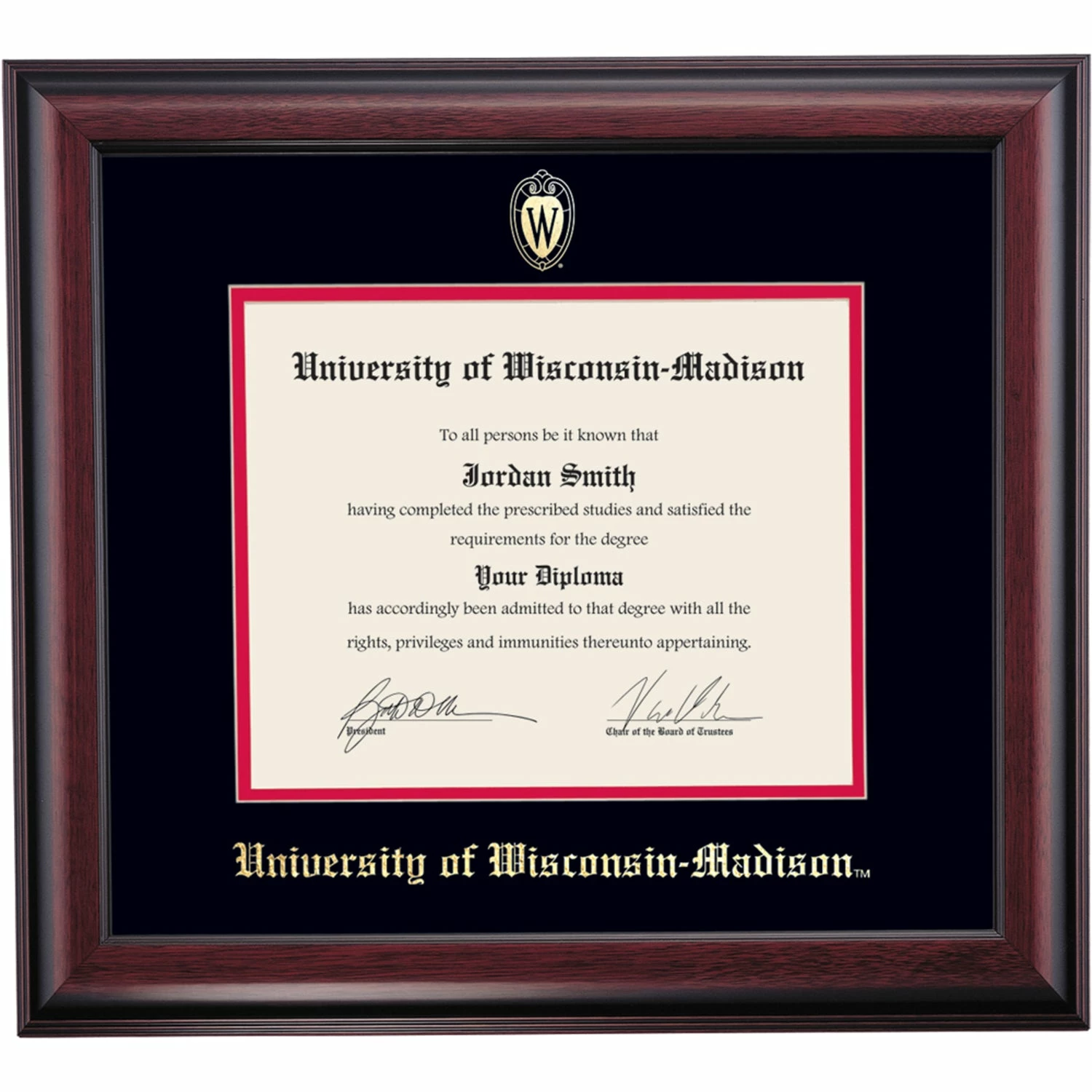 Celebrate your graduation in style with this handcrafted diploma frame. Custom crafted to fit your University of Wisconsin-Madison diploma, this frame is embossed with your school name and seal and features Black/Cherry accent matting and high quality hardwood moulding.